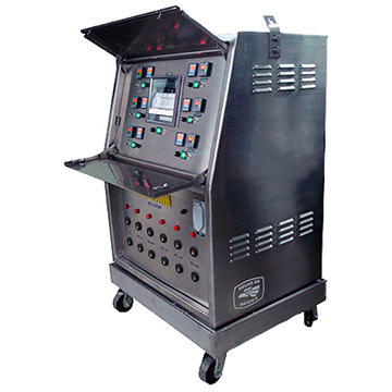 Con interruptor de protección contra cortes de corriente, con alimentación primaria de 440/480VAC, 3 fases, 60Hz y 65/85 Volts de salida con sistema de enfriamiento por inducción de aire forzado, transformador de control a 110 Volts de C.A. para alimentación del circuito electrónico de control, con sistema de protección regulada al mismo, con sistema de protección electromagnética contra cortos circuitos en su alimentación primaria, una estación de botones de paro y arranque con focos de señalización para aislar el sistema de control de fuerza para seguridad y/o emergencia, con contactores de platinos de 300 Amp. C.I. con protección contra sobretenciones inducidos a los controladores, sus 6 salidas con conectores hembra 300 Amp. de bronce con revestimiento de neopreno antiflama para altas temperaturas, carro metálico de acero inoxidable y funda de lona.